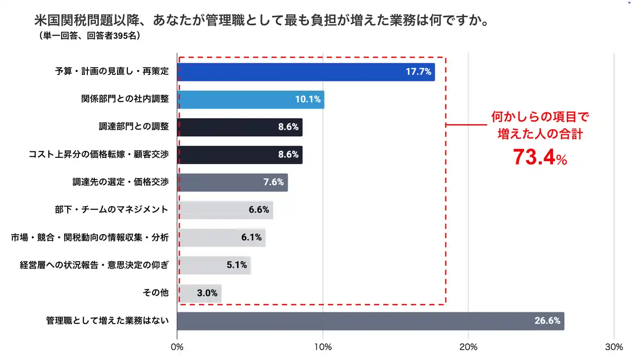 ・管理職の約7割が米国関税問題以降に業務負担の増加を実感。最も負担が増えた業務は「予算・計画の見直し・再策定(17.7%)」が最多となりました。 |