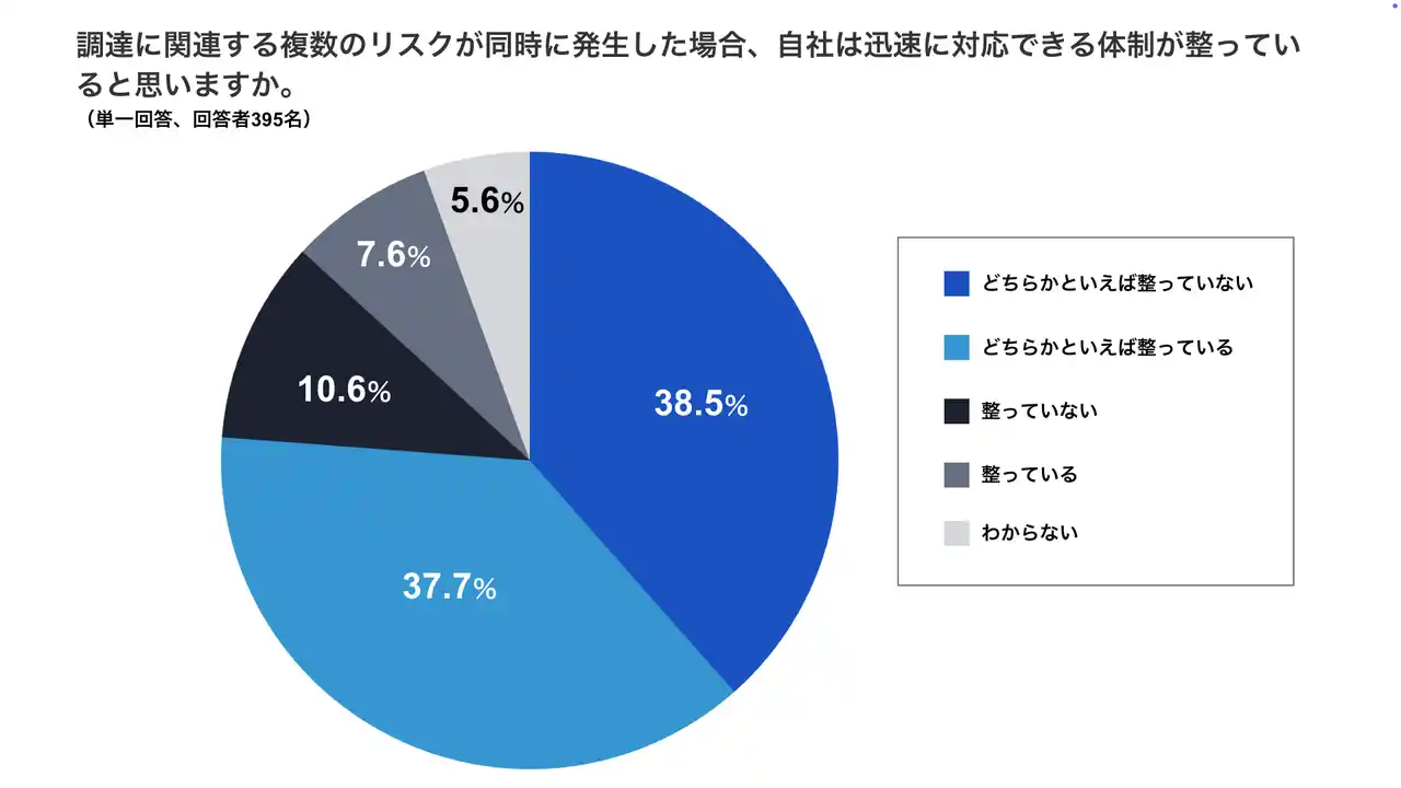 ・複数の調達リスクが同時発生した際に迅速に対応できる体制が「整っていない(10.6%)」「どちらかといえば整っていない(38.5%)」の合計は約5割(49.1%)に達しました。およそ半数の企業が、対応体制に不安を抱えている実態が浮き彫りとなりました。 |