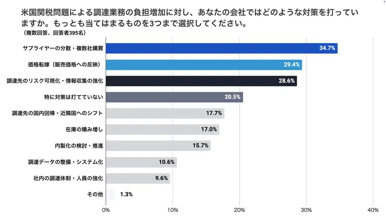・約8割の企業が何らかの対策を実施しており、最も多く選ばれたのは「サプライヤーの分散・複数社購買(34.7%)」次いで「価格転嫁(29.4%)」「調達先のリスク可視化・情報収集の強化(28.6%)」が続き、調達先の多元化とコスト対応を軸とした対策が主流となっています。 |