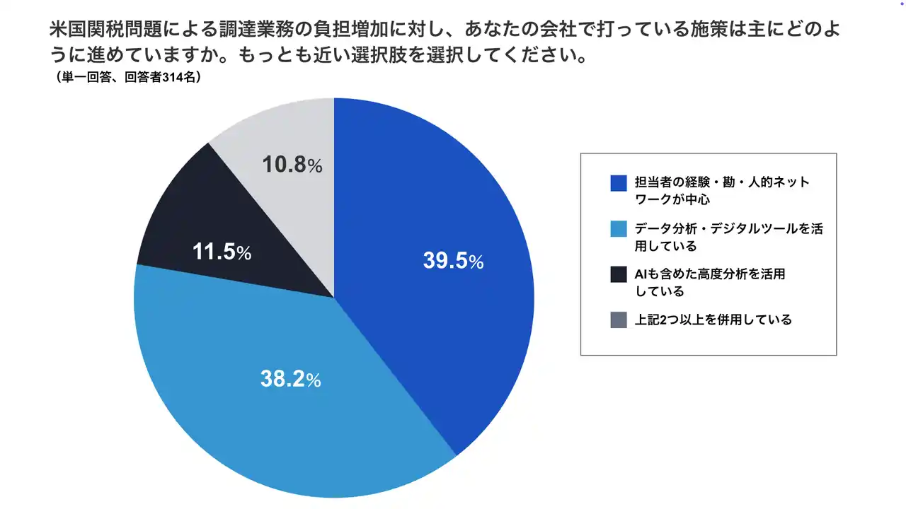 ・対策を進める企業のうち、「担当者の経験・勘・人的ネットワークが中心(39.5%)」が最多となり、約4割が依然として属人的な対応に頼っています。「データ分析・デジタルツールを活用している(38.2%)」がほぼ同率で続きましたが、「AIも含めた高度分析を活用している(11.5%)」は1割程度にとどまりました。 |