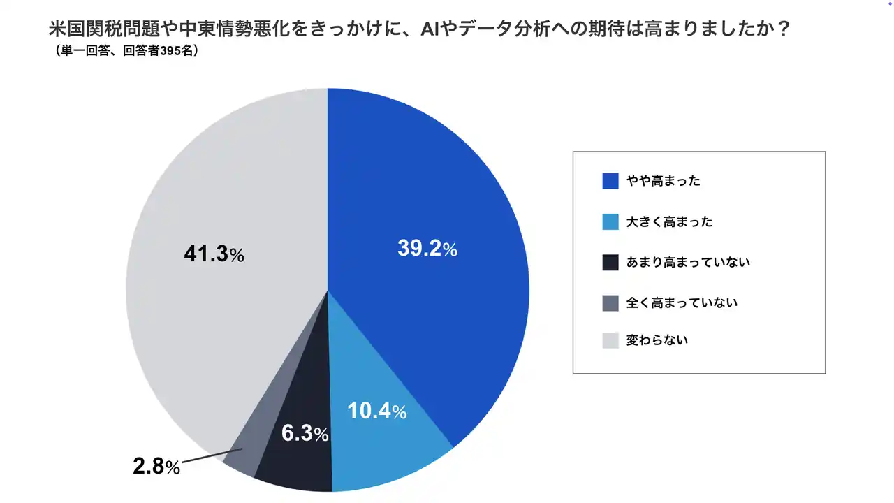 ・米国関税問題や中東情勢悪化をきっかけに、AIやデータ分析への期待が「大きく高まった(10.4%)」「やや高まった(39.2%)」と回答した管理職は合計約5割(49.6%)にのぼりました。 |