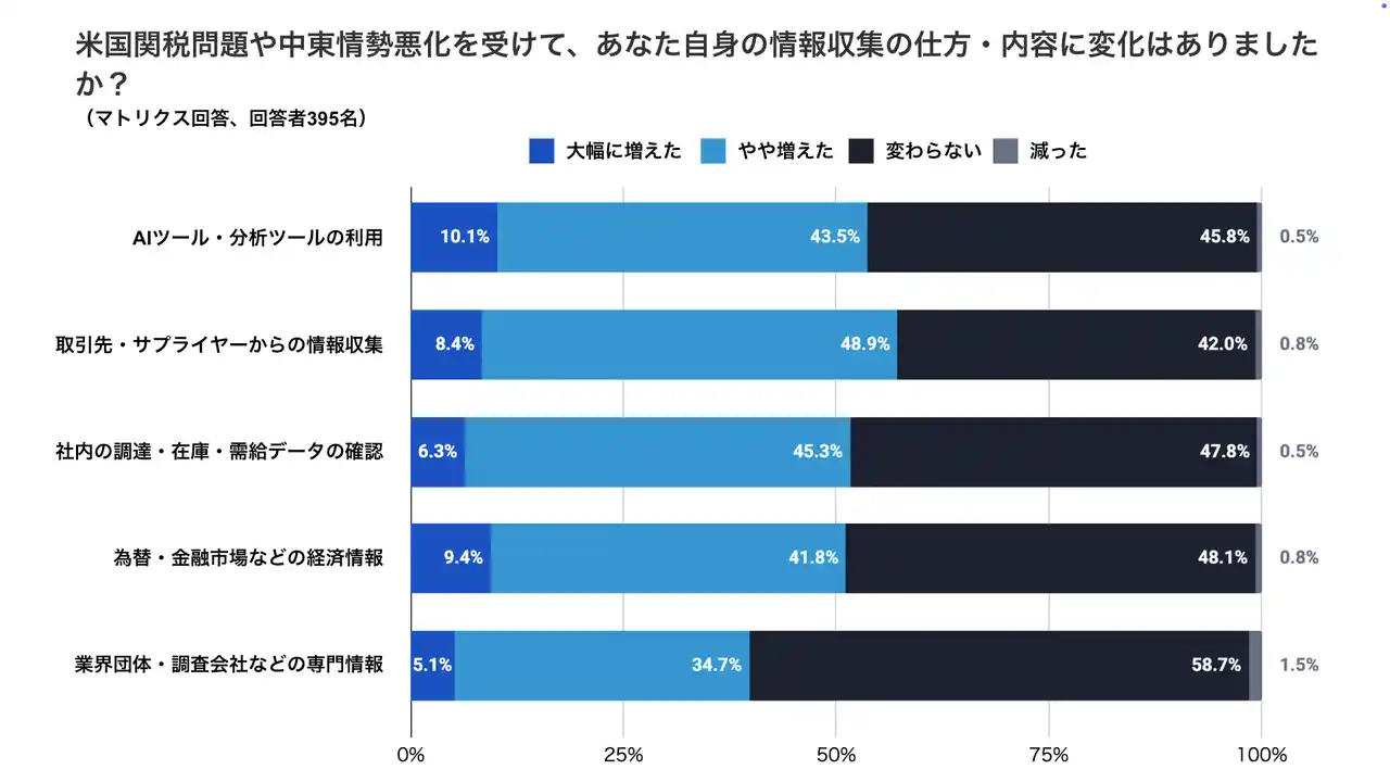 ・情勢変化を受けて情報収集の仕方や内容が変化したと感じる管理職は、項目によって異なるものの「大幅に増えた」「やや増えた」の合計で半数弱にのぼりました。最も増加割合が高かったのは「取引先・サプライヤーからの情報収集(57.3%)」で、次いで「AIツール・分析ツールの利用(53.6%)」「社内の調達・在庫・需給データの確認(51.6%)」が続きました。 ・一方、約半数は情報収集の変化を「感じていない」とも読め、危機感の温度差が企業・個人間で生じていることがうかがえます。 |
