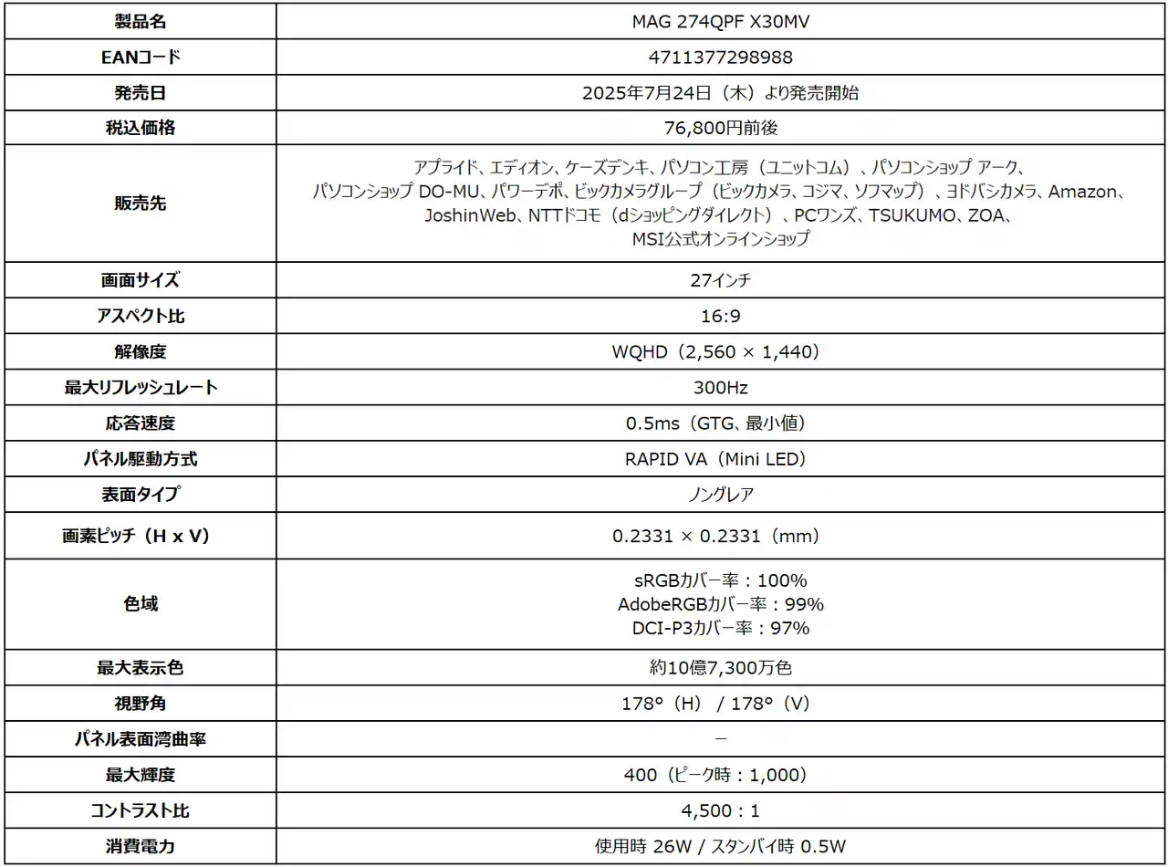 この度、エムエスアイコンピュータージャパン株式会社は2025年7月24日(木)より、ゲーミングモニターの新モデルを発売いたします。高いゲーミング性能とコストパフォーマンスに優れた『MAG』シリーズから、Mini LEDと量子ドット技術を搭載し、WQHD解像度、リフレッシュレート300Hz、応答速度0.5ms(GTG、最小値)の高いゲーミングスペックで、メリハリのある高精細で滑らかな映像を実現した「MAG 274QPF X30MV」が新たにラインナップに加わります。 |