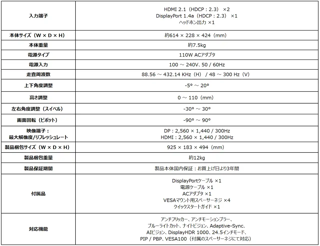 ・リフレッシュレート300Hz & 応答速度0.5ms(GTG、最小値) |