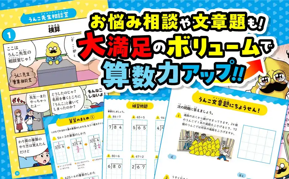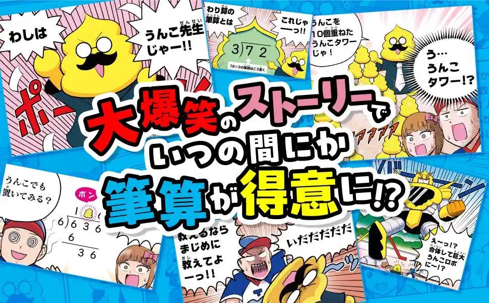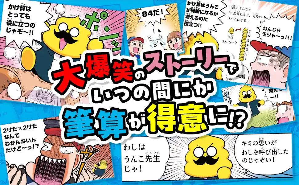 お子さまに面白く学びを伝えるうんこ先生が、かけ算やわり算の筆算の学習を、「うんこ」を使って教えます。 |