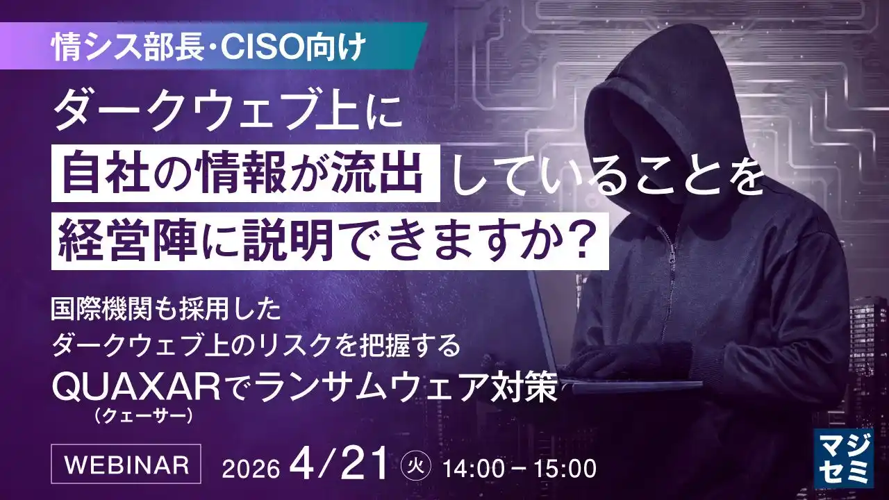 | マジセミ株式会社は「【情シス部長・CISO向け】ダークウェブ上に自社の情報が流出していることを経営陣に説明できますか?」というテーマのウェビナーを開催します。 |