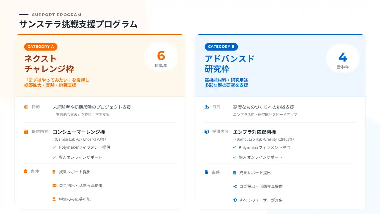 | 株式会社サンステラ(本社:東京都)は、3Dプリンターを活用したものづくり・研究・挑戦を支援する新制度「サンステラ挑戦支援プログラム」を開始いたします。 | |||