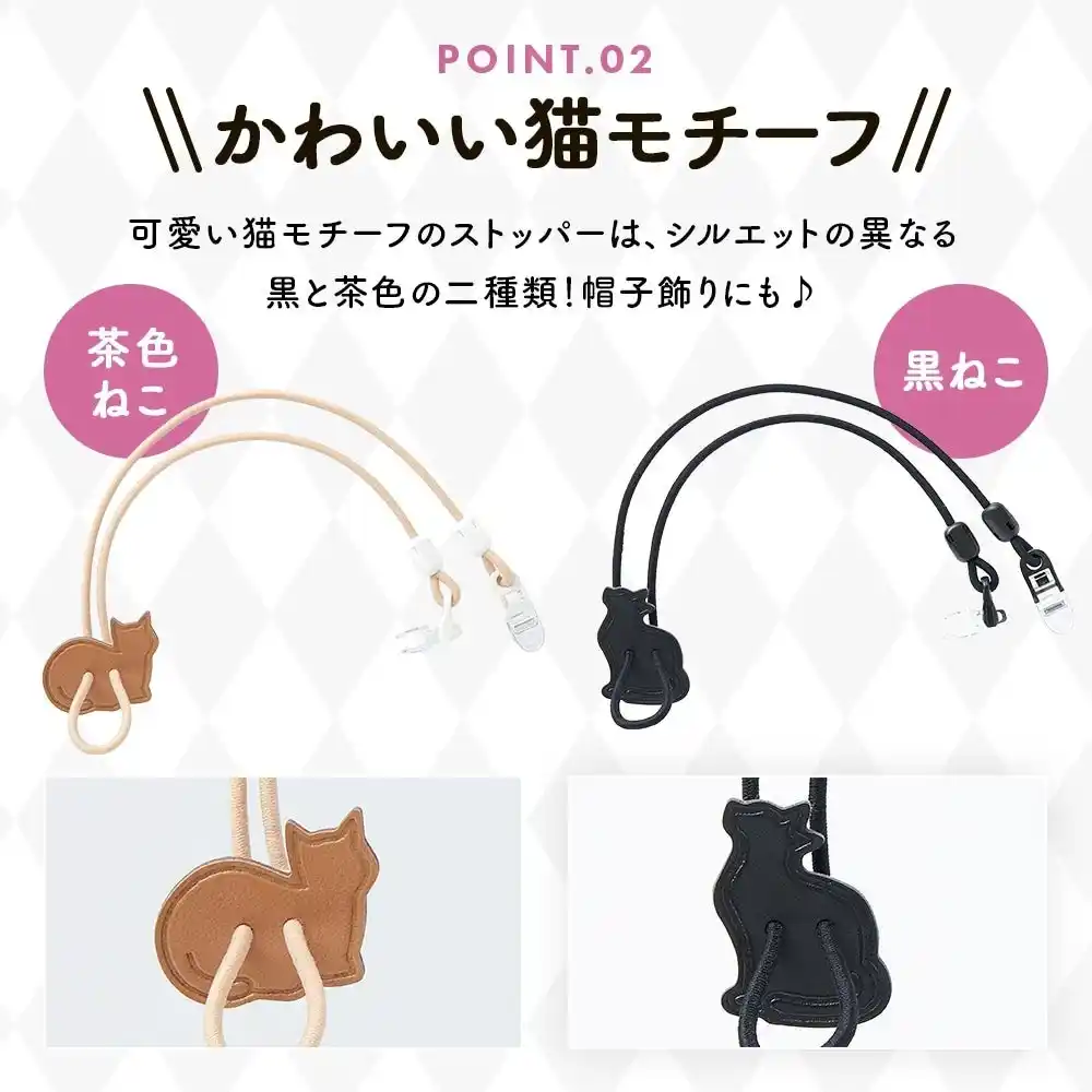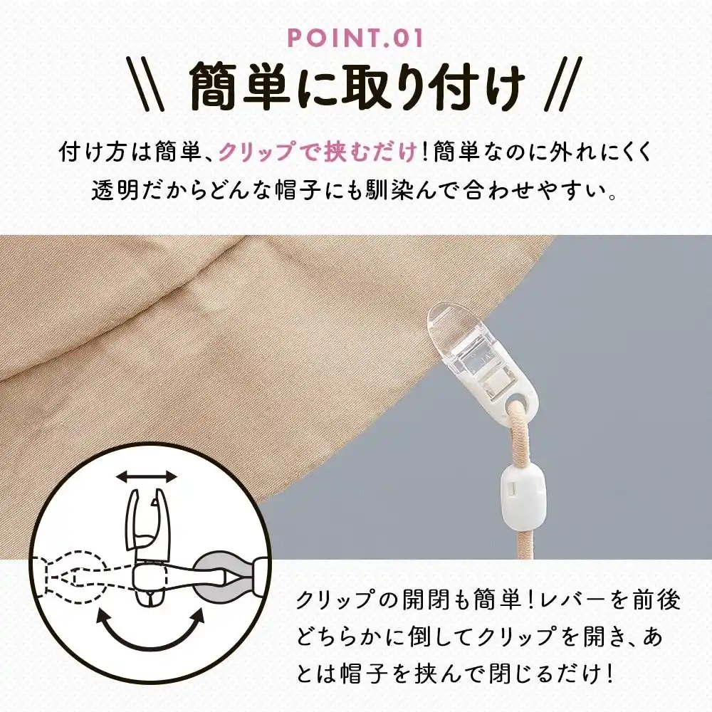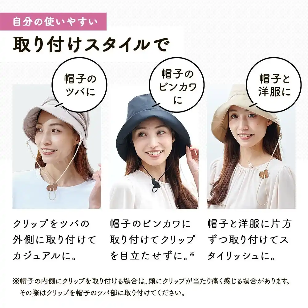 | クリップで挟むだけの簡単取り付け!外れにくいクリップで、風で帽子が飛ぶのを防いでくれる帽子ストッパーです。かわいいねこのストッパーでサイズ調節が可能。帽子のツバやビンカワにあご紐のように取り付けたり、帽子のツバと洋服に取り付けたりと、取り付け方もいろいろ! | |||||||||