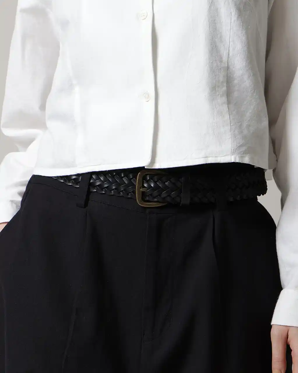 バングラデシュの自社工場にて、職人が一本ずつ手編みで仕立てたレザーベルト。 最大の特徴は、約3メートルに及ぶ4本のレザー紐を、一度も裁断せずにバックルまで一気に編み上げる手仕事です。 |