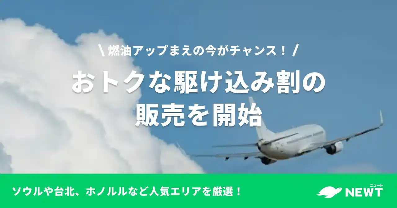 | 株式会社令和トラベル(本社:東京都渋谷区、代表取締役:篠塚 孝哉)が運営する、かしこい、おトク、旅行アプリ『NEWT(ニュート)』は、2026年6月販売分より航空各社の燃油サーチャージが値上げ予定であることを受け、燃油サーチャージ値上げ前の予約を後押しする、おトクな駆け込み割を販売します。 | |||