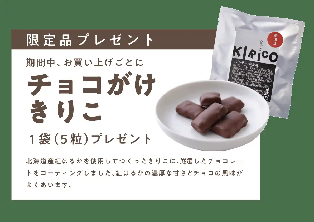 期間中は金額に関わらず、1会計ごとに、プレゼント限定の味『チョコがけきりこ』を1袋プレゼント!限定商品のため、皆さまお誘いあわせの上、ぜひこの機会にお召し上がりください。皆さまのご来店、心よりお待ちしております。 |