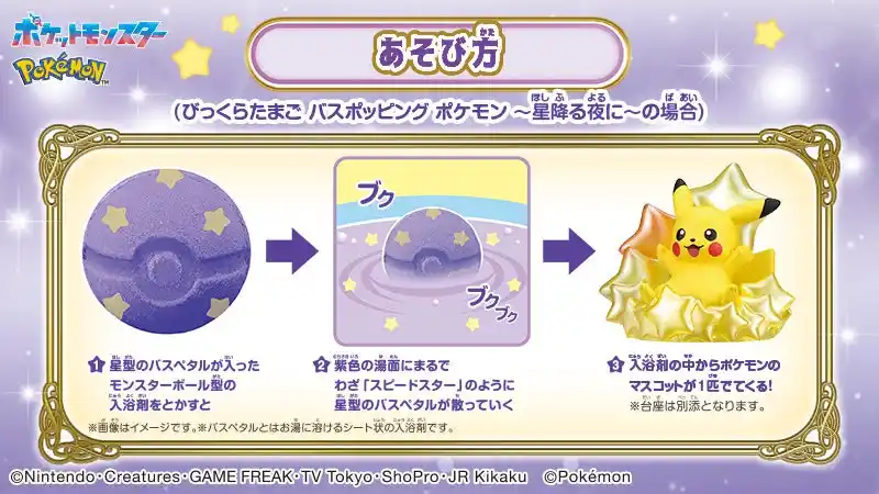 星型のバスペタルが入ったモンスターボール型の入浴剤をお湯に入れると、お湯の色が紫色に変化するとともに、湯面に星型のバスペタルが散っていきます。その様子は、「スピードスター」のわざのエフェクトを思わせます。入浴剤が溶け終わると、ポケモンのマスコットが1匹出てきます。 |