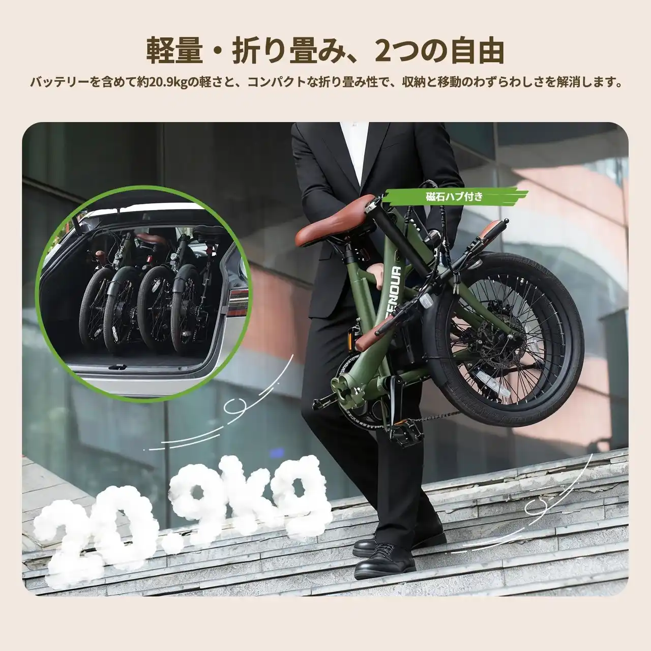 毎日の通勤や買い物における「坂道の辛さ」「乗り降りの不便さ」「駐輪スペースの確保」といった課題を解決すべく、EENOURは走行性能と利便性を高次元で融合させた「S1」を開発しました。 |