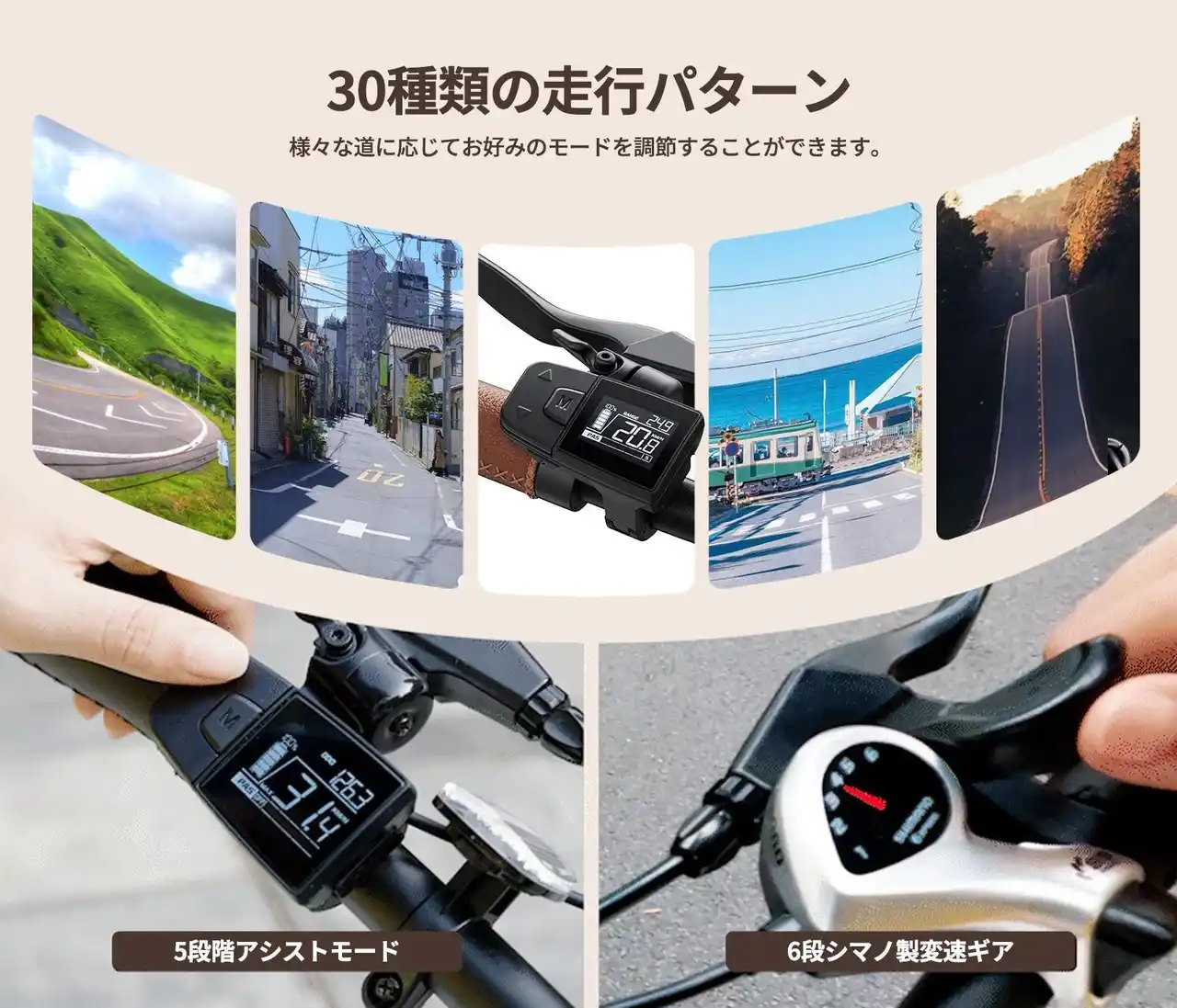 「電動アシスト5段階」×「SHIMANO製6段変速」の組み合わせにより、最大30通りの走行モードを選択可能。勾配や交通状況に合わせ、常に最適なペダリングを提供します。 |