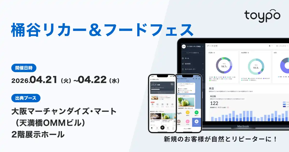| 行動のきっかけを生み出す顧客体験プラットフォーム”toypo” を提供する株式会社トイポ(福岡市中央区、代表取締役:村岡 拓也、以下「トイポ」)は、2026年04月21日(火)~22日(水)に大阪マーチャンダイズ・マート(天満橋OMMビル)で開催される「桶谷 リカー&フードフェス2026」に出展いたします。 | |||