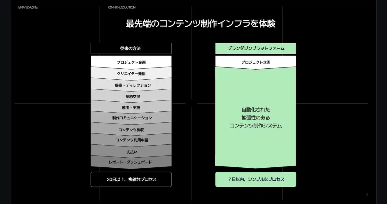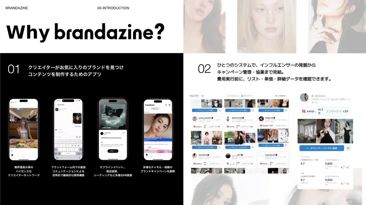 | Brandazineは、透明性の高いデータと成果重視のアプローチにより、厳選されたクリエイターとブランドをつなぎ、マーケティングの成果を明確かつ説明責任をもって計測するクリエイターマーケティングプラットフォームを提供しています。 | ||||||||||