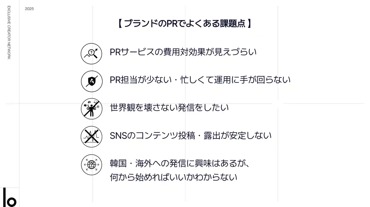 | 現在、約9,000名の契約クリエイターが登録しており、Converse、Wooyoungmi、Mulberry、Michael Kors、サザビーリーグ、Hince、アモーレパシフィック、MUSINSA、現代百貨店など、韓国内外の800以上の有力ブランドと協業しています。クリエイターコンテンツ制作のエンドツーエンドプロセス、ソーシャルメディアデータを統合したデータインフラ、そしてAI技術の活用により、透明性と戦略的整合性を伴って実行されるクリエイターマーケティングは、従来の運用型広告チャネルと比較して大幅にコスト効率が高く効果的であることを実証してきました。 | ||||||||||