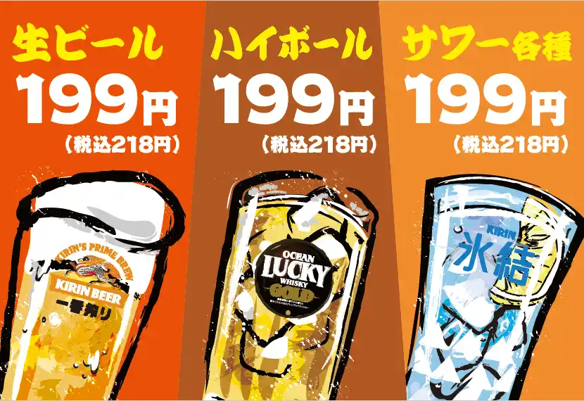 ■いつでも「生ビール・ハイボール・レモンサワー」が199円(税込218円)! |