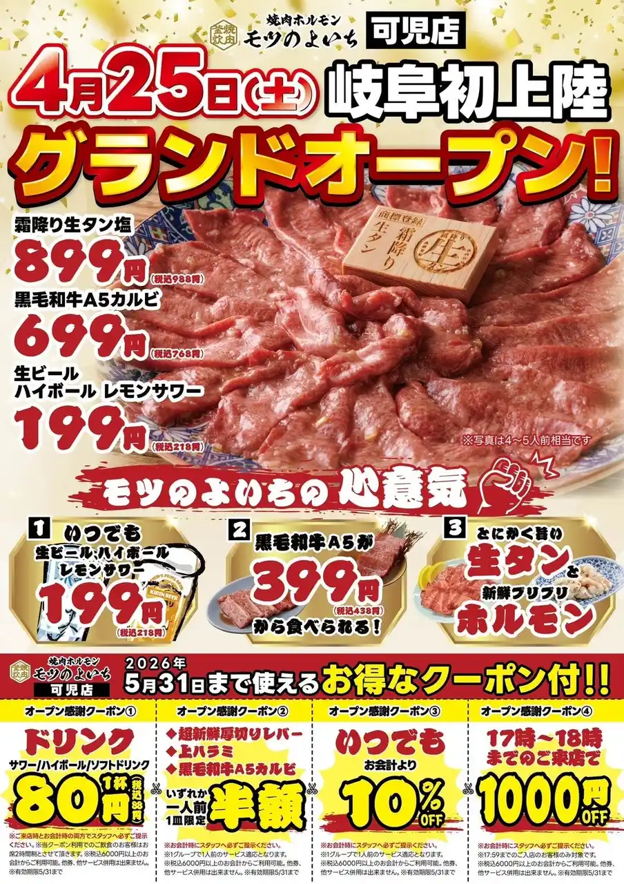 三重県を中心に展開し、連日行列の絶えない人気焼肉店「焼肉ホルモン モツのよいち」が、2026年4月25日(土)、ついに岐阜県へと初上陸いたします。可児市の新たな食の拠点として、最高品質の「商標登録 霜降り生タン」や「黒毛和牛A5カルビ」を、日常使いできる圧倒的な低価格でご提供いたします。 |