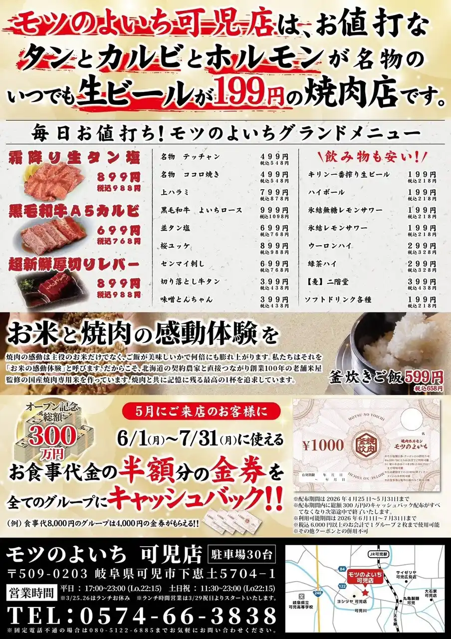岐阜初出店を記念し、可児店限定で「半額キャッシュバック」キャンペーンを実施いたします。 ・特典内容: 5月中にご来店のお客様へ、6月・7月で利用可能な**「お食事代金の半額分」の金券**をキャッシュバック! |