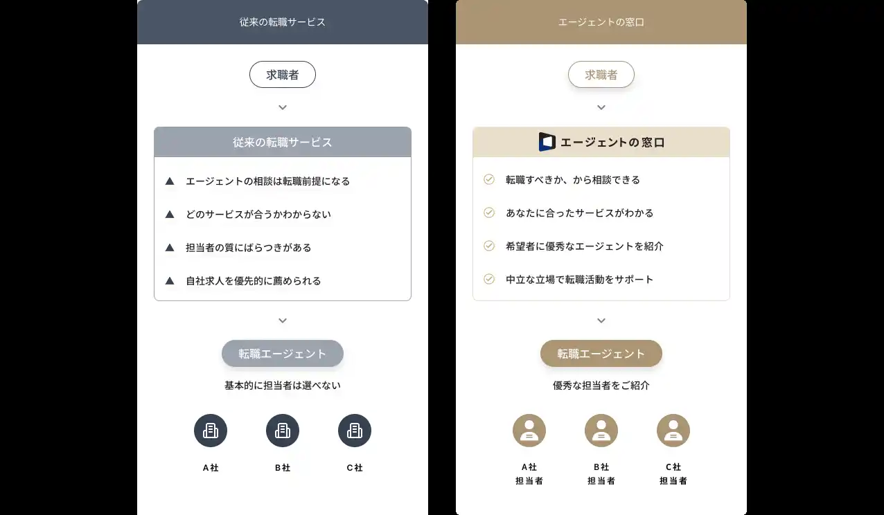 こうした「相談の場の中立性不足」や「エージェント選定の難しさ」を解決するために立ち上げたのが『エージェントの窓口』です。 |