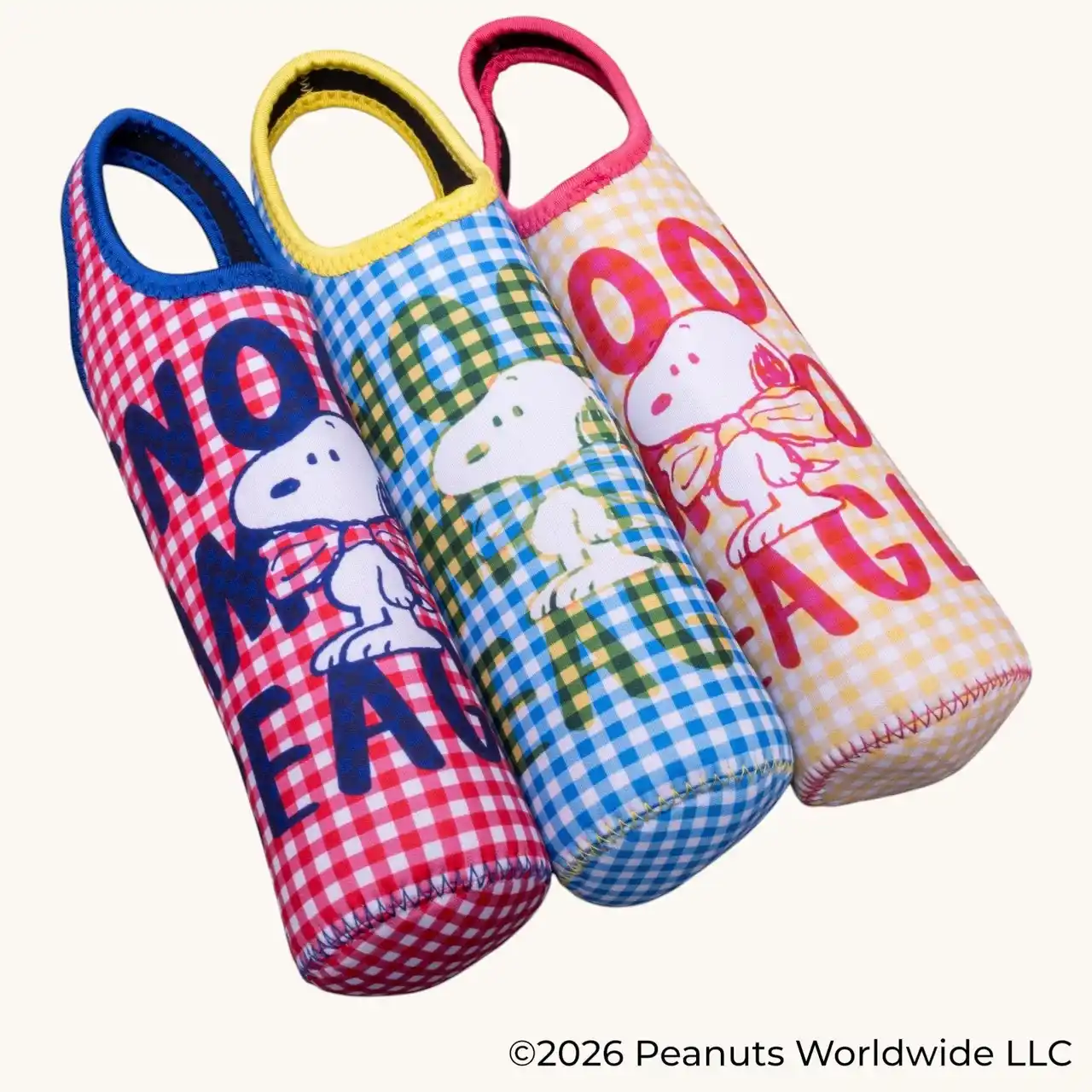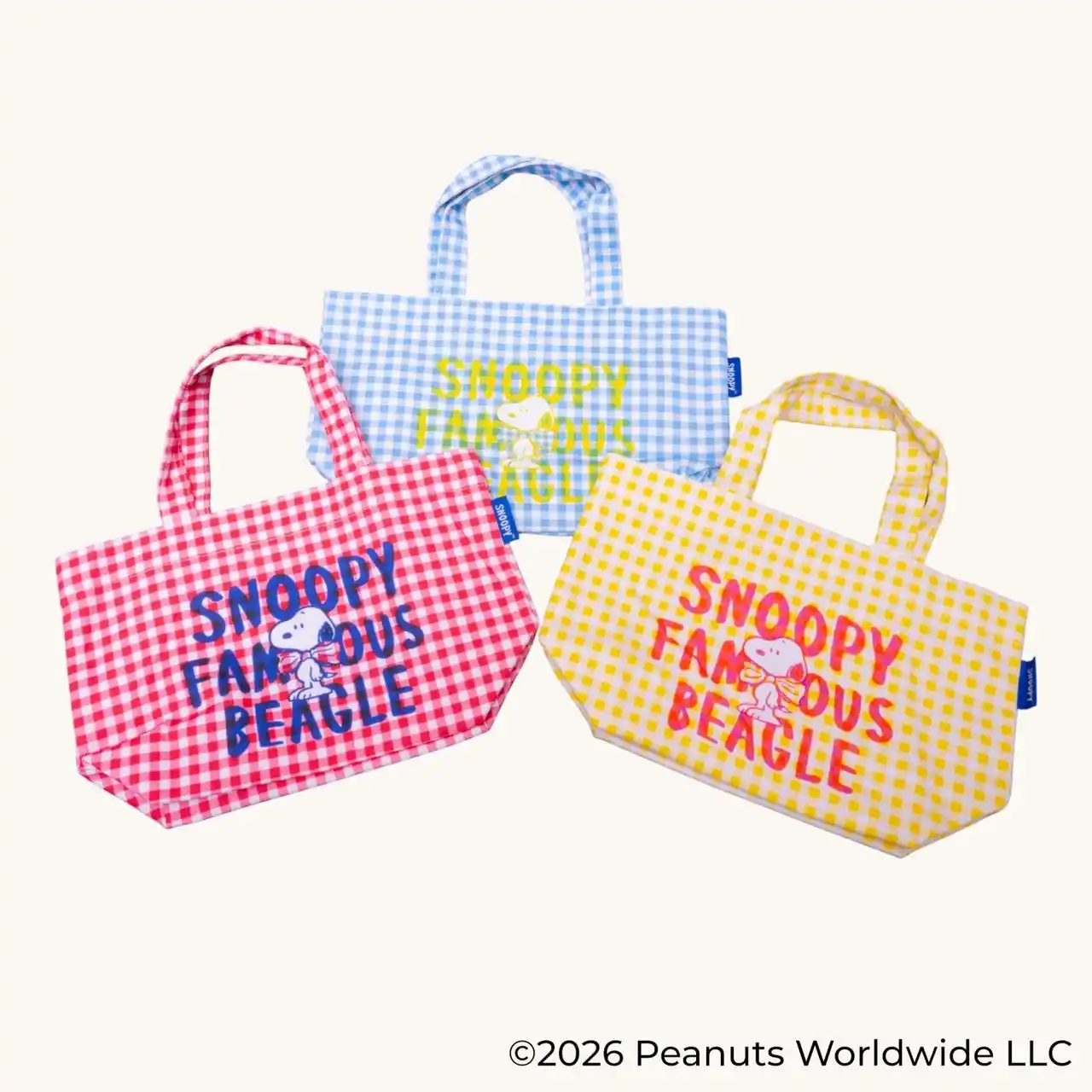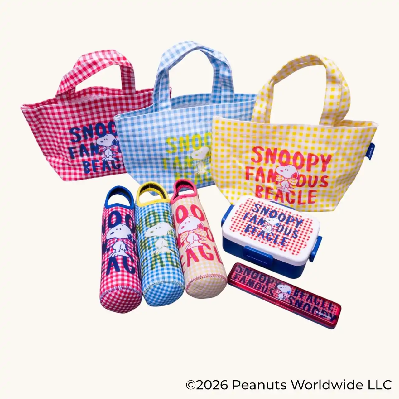 本シリーズは、鮮やかなギンガムチェック柄に蝶ネクタイでおめかしした「スヌーピー」が特徴のデザインです。 |