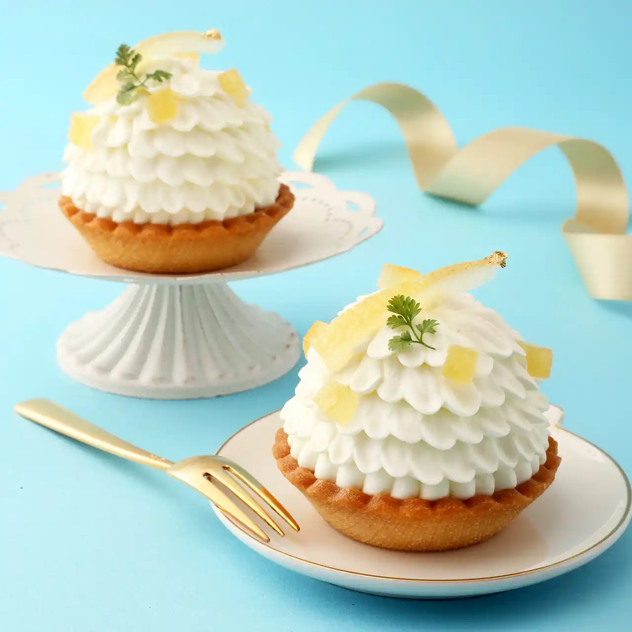 キュンと甘酸っぱいレモンのクリームを香ばしいアーモンドタルトにのせて。クリームを花のようにしぼり、レモンピールを飾りました。 |