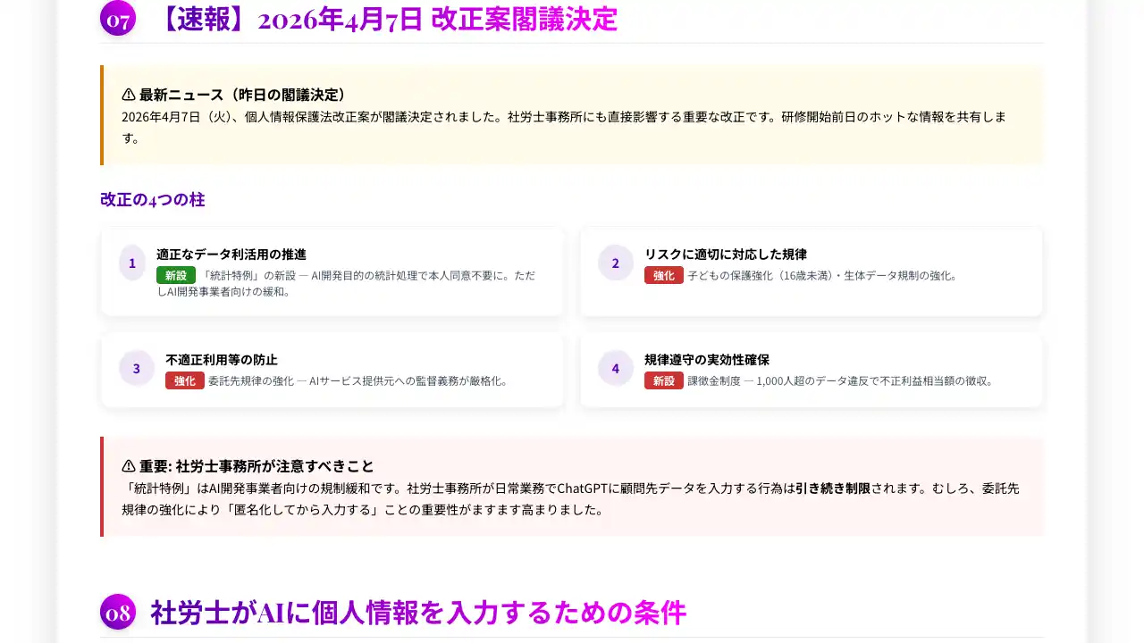 2026年4月7日(火)、個人情報保護法の改正案が閣議決定されました。本改正案は「3年ごと見直し」に基づくもので、AI時代の個人データ利活用と保護の両立を目指す内容です。 |