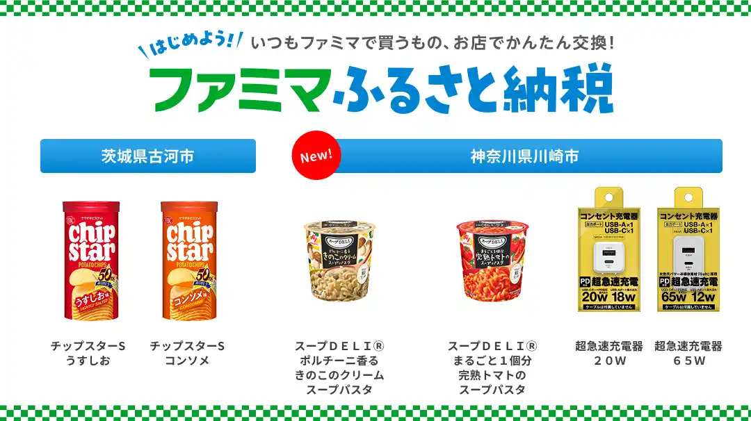 | 神奈川県川崎市からは、お湯を注ぐだけで手軽に小腹を満たせる「スープDELI(R) まるごと1個分完熟トマトのスープパスタ/ポルチーニ香るきのこのクリームスープパスタ」のほか、スマートフォンやPCの充電に欠かせない、「超急速充電器(20W/65W)」が登場いたします。また、茨城県古河市からは、おやつや行楽のお供に長年親しまれている「チップスターS(うすしお/コンソメ)」が仲間入りします。 | |||||||||||||||||||||||||