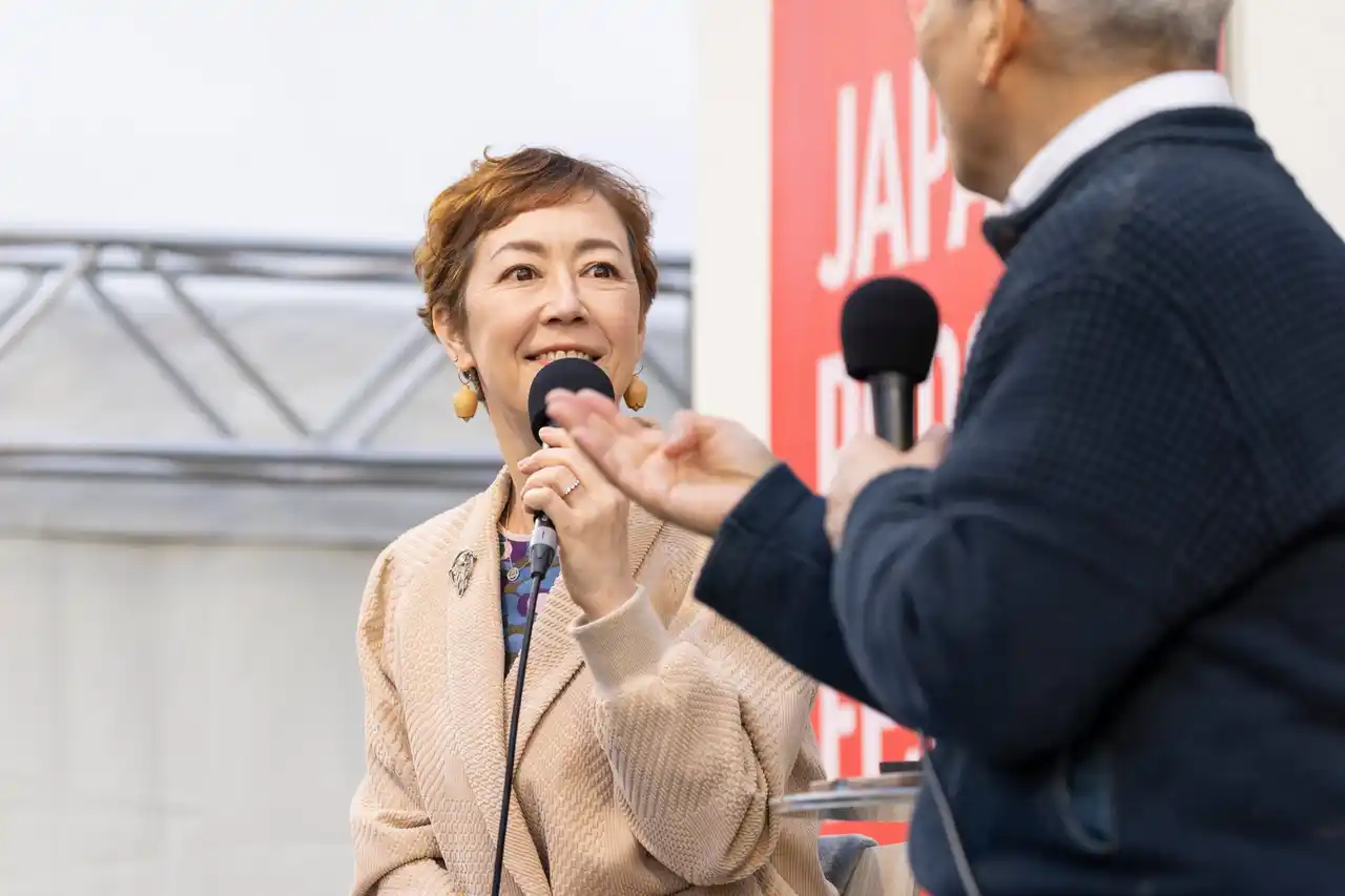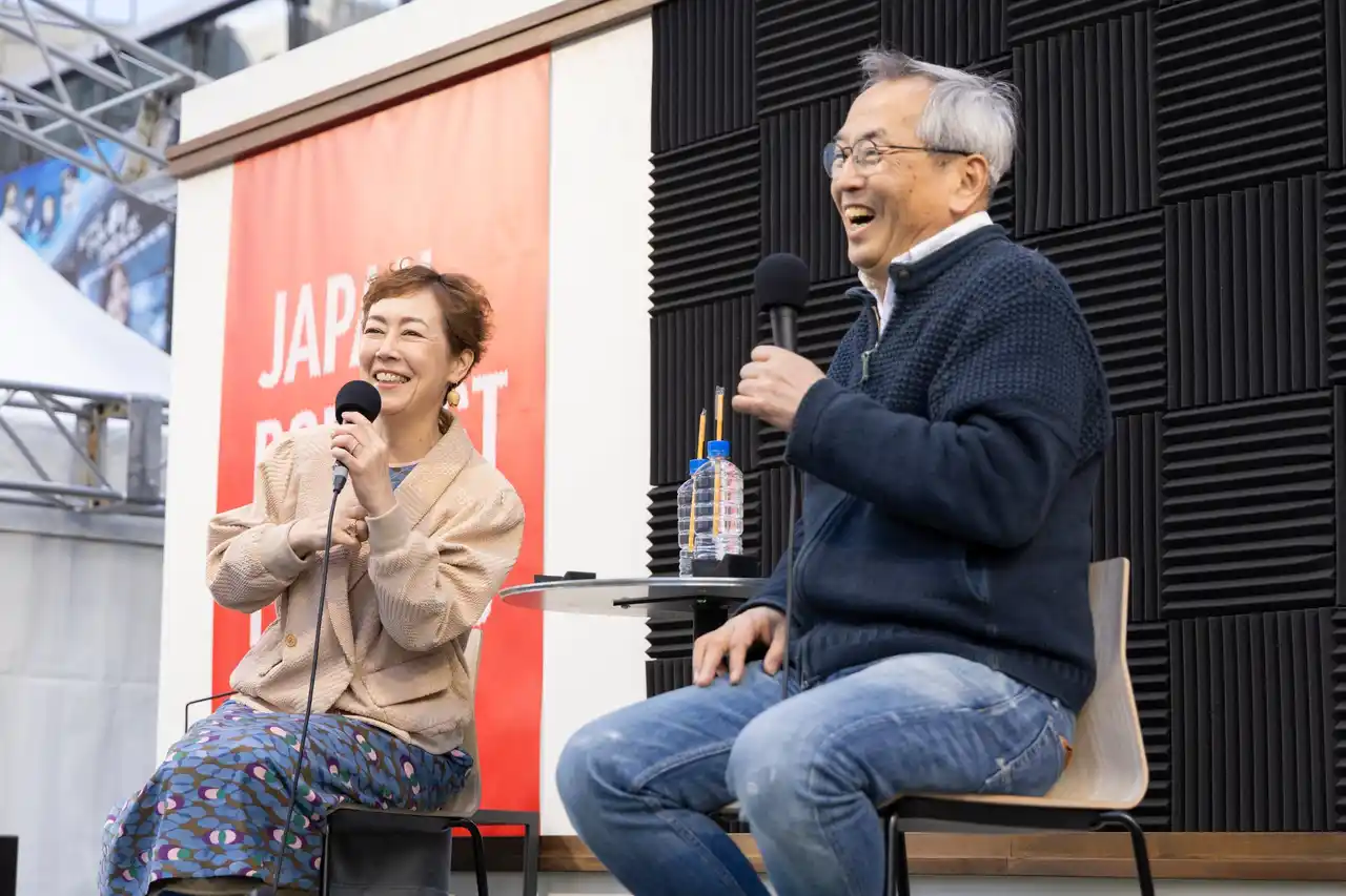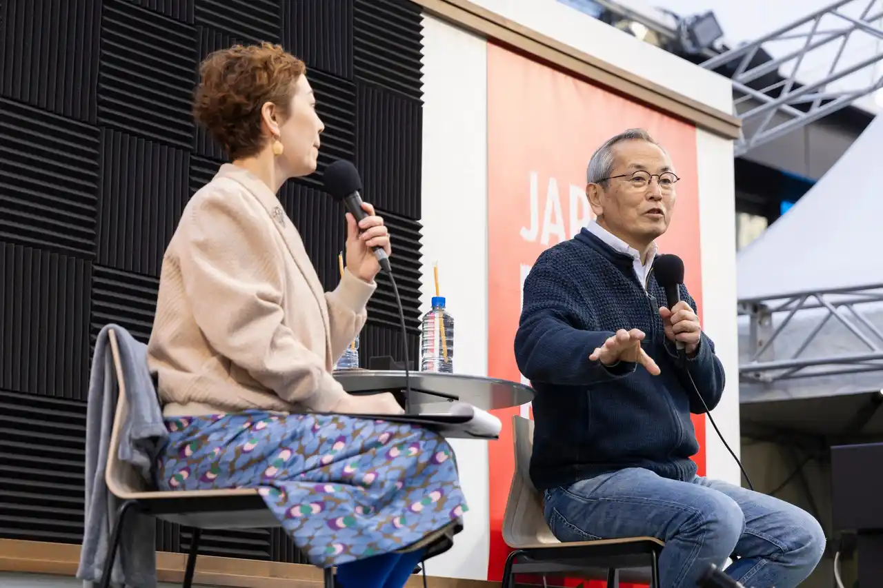 大勢のファンの拍手と歓声に迎えられ、ステージに土井善晴とクリス智子が登場した。二人のポッドキャストが始まって3年半。今回は番組初となる公開収録だ。会場は笑顔に包まれ、いつも以上に熱を帯びた“料理を哲学する”トークが繰り広げられた。 |