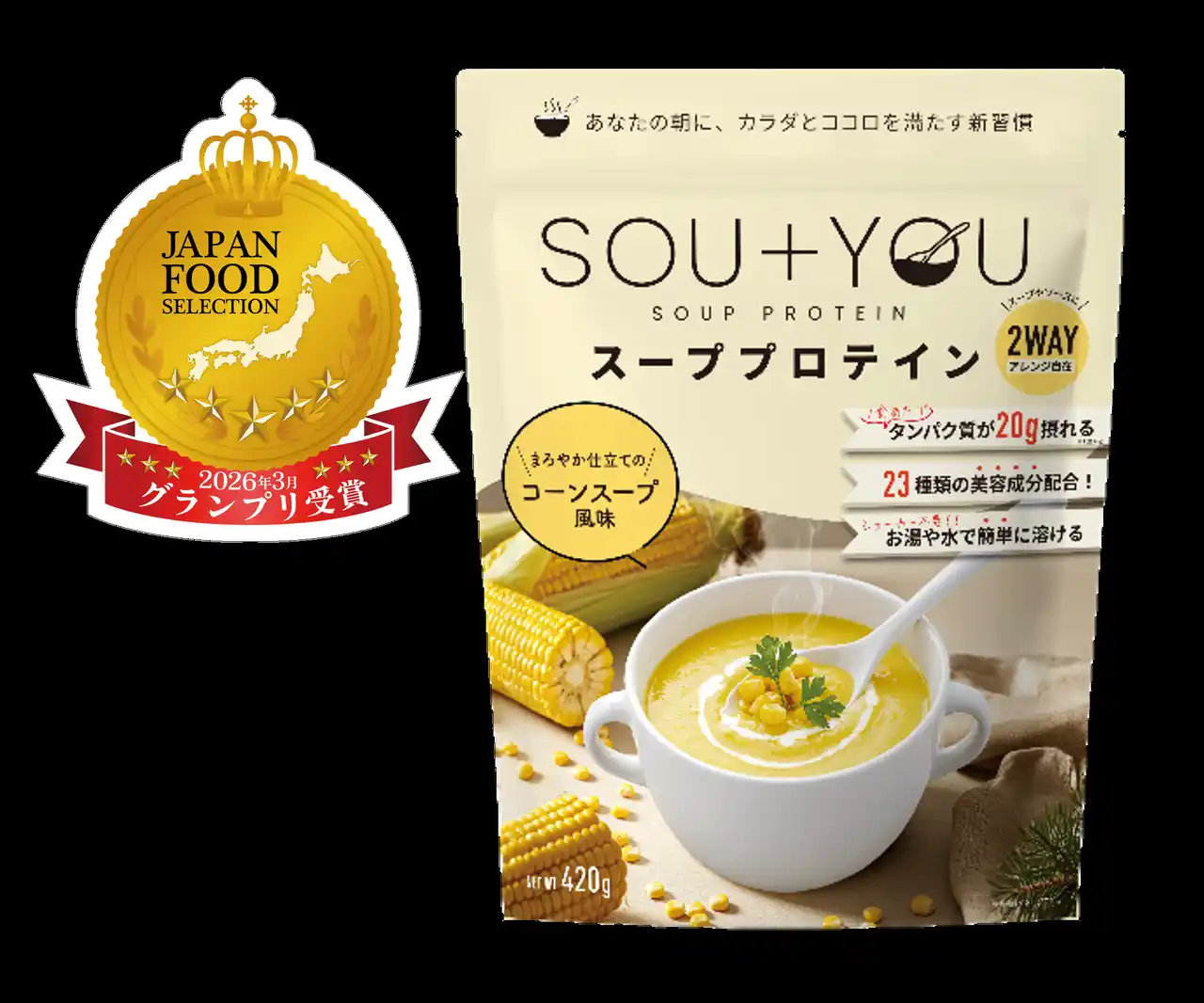 プロテインやスポーツサプリメントなど、革新的な商品を展開し、健康食品事業を強化している株式会社ウエニ貿易(本社:東京都台東区、代表取締役社長:宮上光喜)が展開するウェルネスブランド「MY ROUTINE(マイルーティーン)」の「SOU+YOU(スーユー) コーンスープ風味」は、一般社団法人日本フードアナリスト協会主催の「ジャパン・フード・セレクション」において、グランプリを受賞いたしました。本商品は、たんぱく質を“スープとして取り入れる”新しい発想により、これから迎える暑い季節でも無理なく続けられる栄養習慣として評価されました。 |