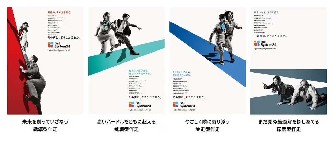新たなキービジュアルは、“成功に伴走するビジネスパートナー”としての当社の在り方を、ブランドメッセージとして打ち出しています。お客様が抱える課題に向き合い、その解決を通じて事業成長を支援する当社の姿勢を、「いざなう(誘導型伴走)」「ともに超える(挑戦型伴走)」「寄り添う(並走型伴走)」「探しあてる(探索型伴走)」という4つのアプローチで表現しています。 |