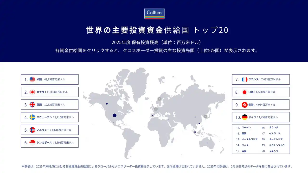 大手総合不動産コンサルティングサービスであるコリアーズ・インターナショナル・ジャパン株式会社(代表:谷川雅洋、本社:東京都千代田区、NASDAQおよびTSX:CIGI、以下コリアーズ・ジャパン)は、世界の商業用不動産投資および資金調達動向を分析した最新レポート 「グローバル キャピタルフロー | 2026年3月」 の和訳版を発刊いたしました。 |