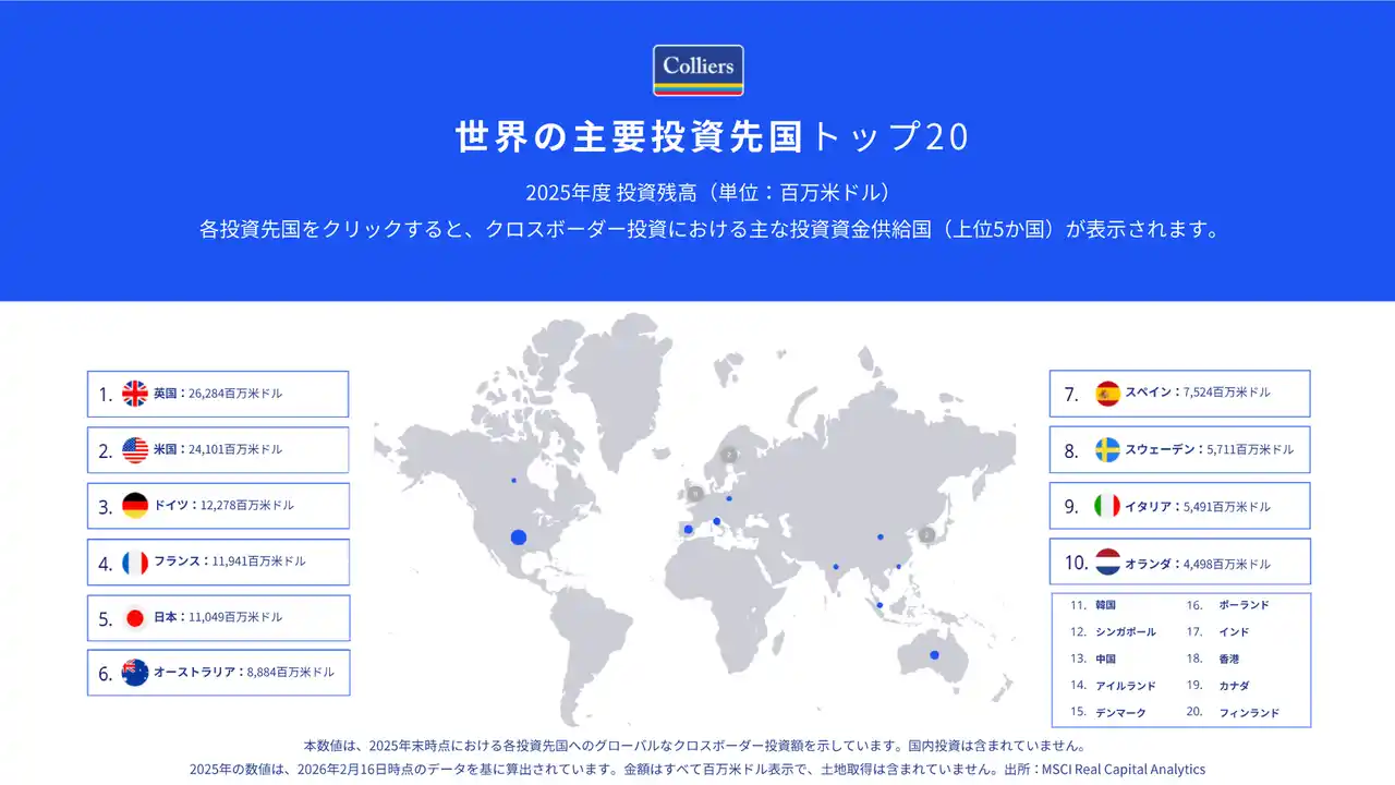 本レポートでは、2025年通期の投資実績をもとに、地域別・セクター別の投資フロー、クロスボーダー資本の動向、資金調達環境の変化、ならびに2026年に向けたマクロ経済・金融環境の見通しについて、コリアーズ独自の分析と各種データを用いて整理しています。 |
