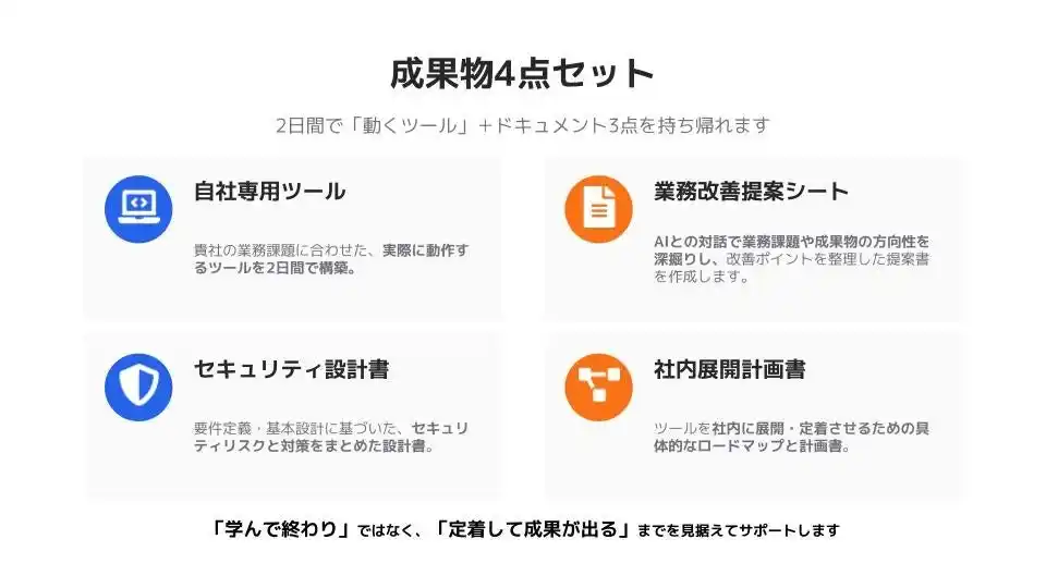 2日間で「動くツール」をその場で即実装 「学んで終わり」にせず、参加企業の個別の業務課題に合わせた実用的なツールを2日間で構築します。あわせて、セキュリティ設計書や社内展開計画書などの成果物4点(自社専用ツール/業務改善提案シート/セキュリティ設計書/社内展開計画書)を持ち帰ることで、翌日から即運用が可能です 。 |