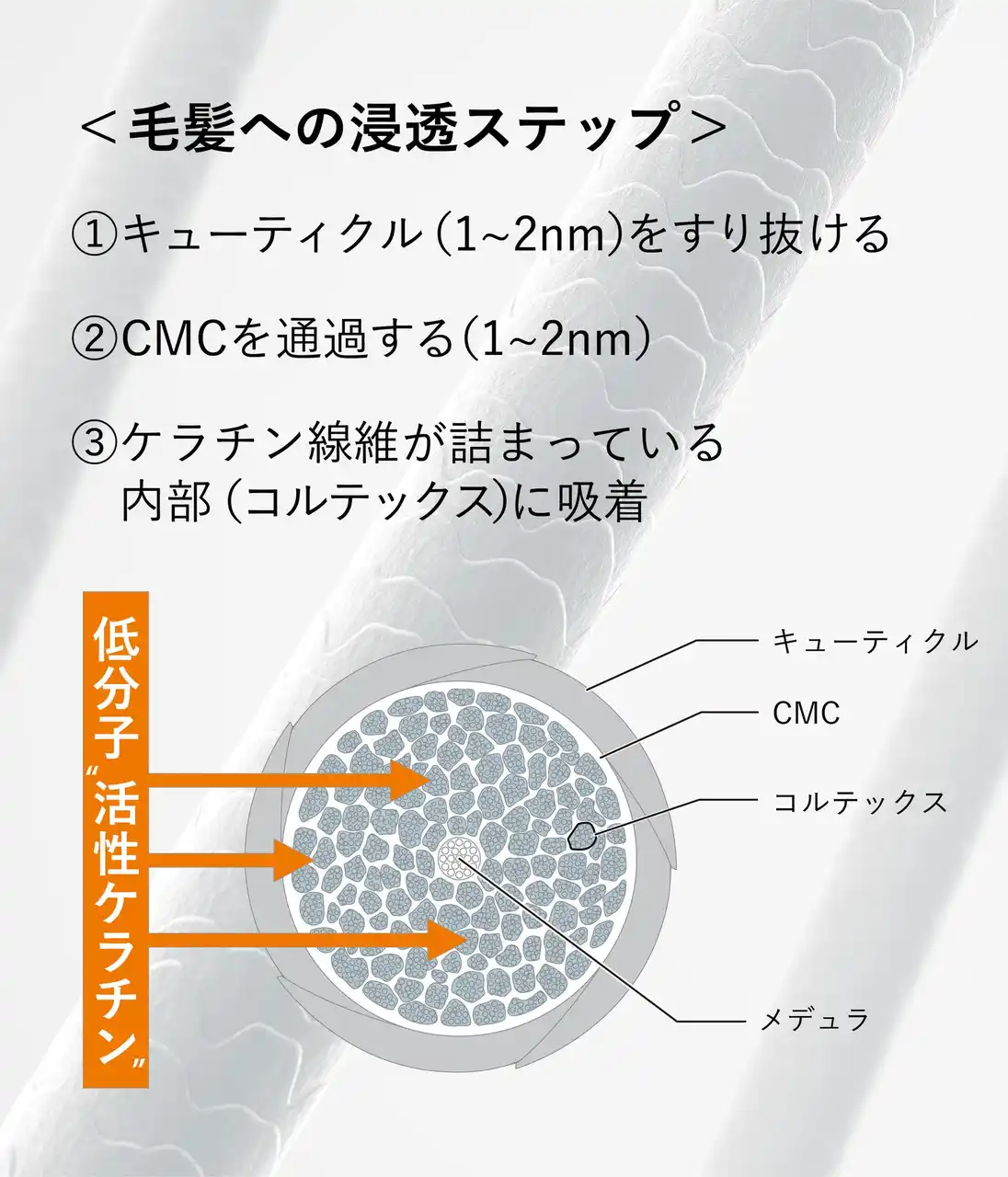 フランス産の低分子“活性ケラチン”*¹等の内部浸透型の低分子補修成分を採用。 |