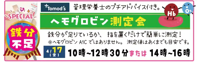 内容:鉄分が足りているか、指を置くだけで簡単測定!管理栄養士の簡単アドバイス付き。 |