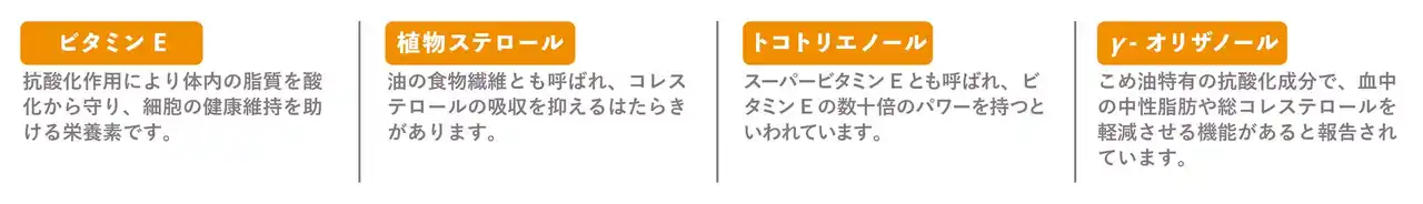 こめ油は、米ぬかや米胚芽由来の天然の栄養成分を豊富に含む食用油です。玄米100kgからわずか1kgほどしか採れない希少な油で、栄養が凝縮されているのも特長です。こうした成分が、酸化に強く、健やかな食生活を支えるおいしさと使いやすさにつながっています。 |