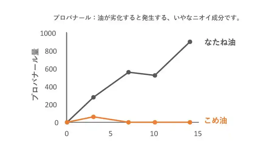 こめ油は、油酔いの原因となるアクロレインや、青臭いニオイの原因物質の発生が少ないのが特長です。揚げ物調理時の不快なニオイがこもりにくく、髪や服にもニオイがつきにくいため、調理に携わる方にも快適です。店内環境の向上や、お客様の食事体験向上にもつながります。 |