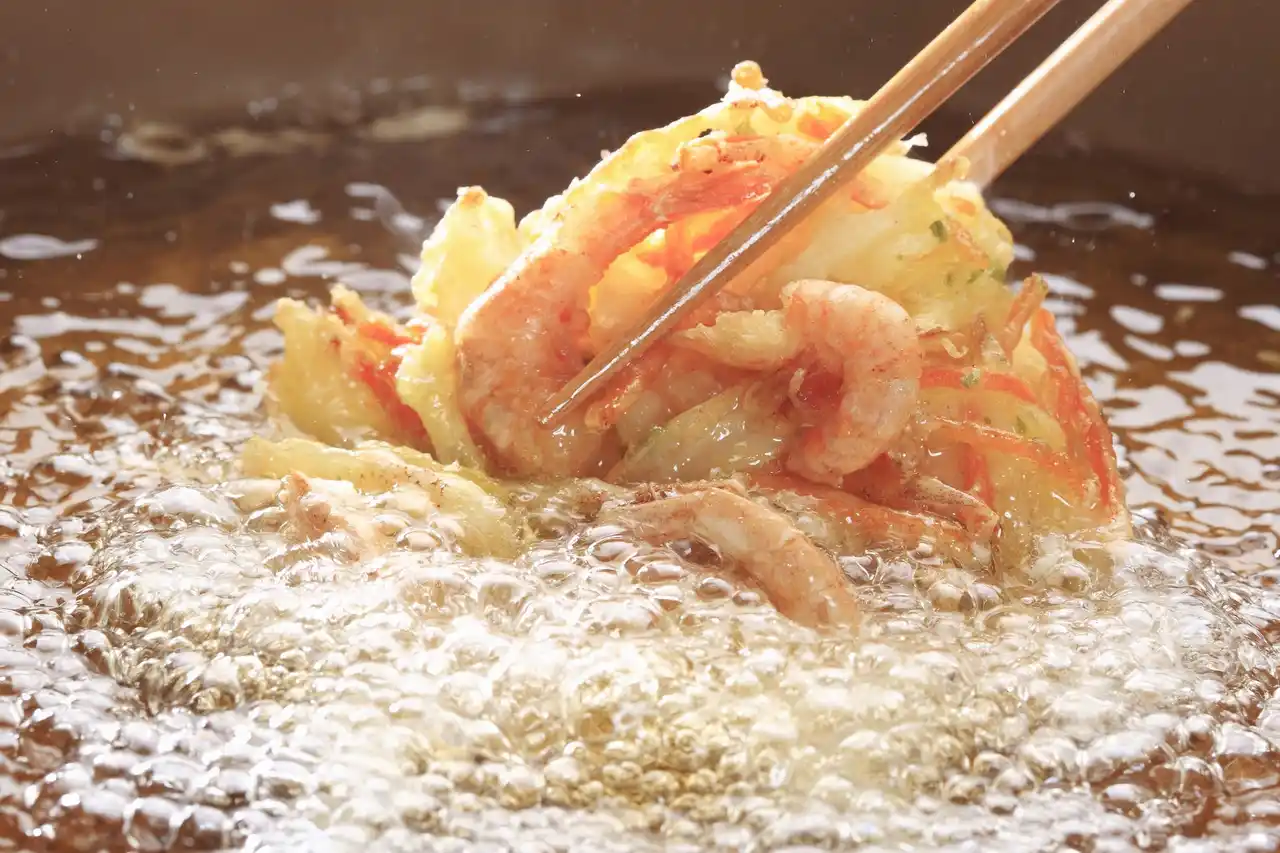 こめ油は抗酸化成分を豊富に含み、酸化しにくく長持ちするのが特長です。泡立ちが少なく、油がサラサラの状態を保ちやすいため、油切れがよく、天ぷらやフライもカラッと軽やかに仕上がります。 |