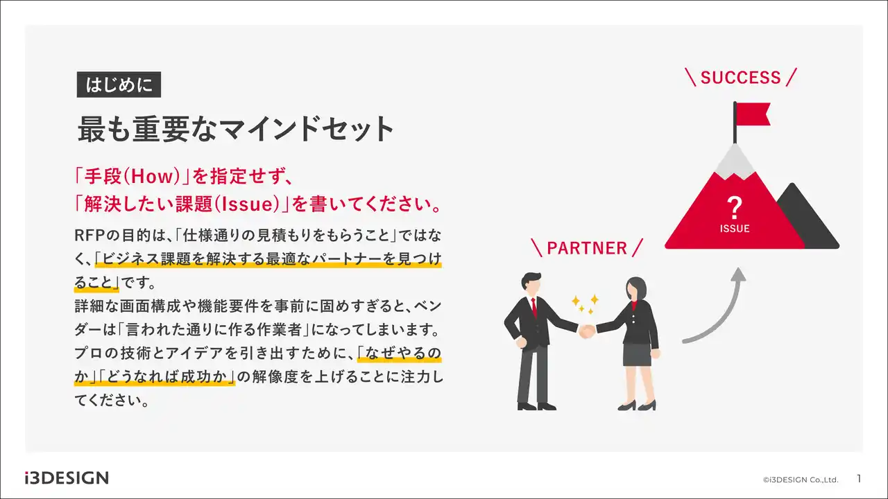 RFPは単なるシステム要件の羅列ではなく、自社のビジネス課題を共に解決する「最適なパートナー」を見極めるための重要なコミュニケーションツールです。本資料が、真のビジネスパートナーと出会うための一助となれば幸いです。 |
