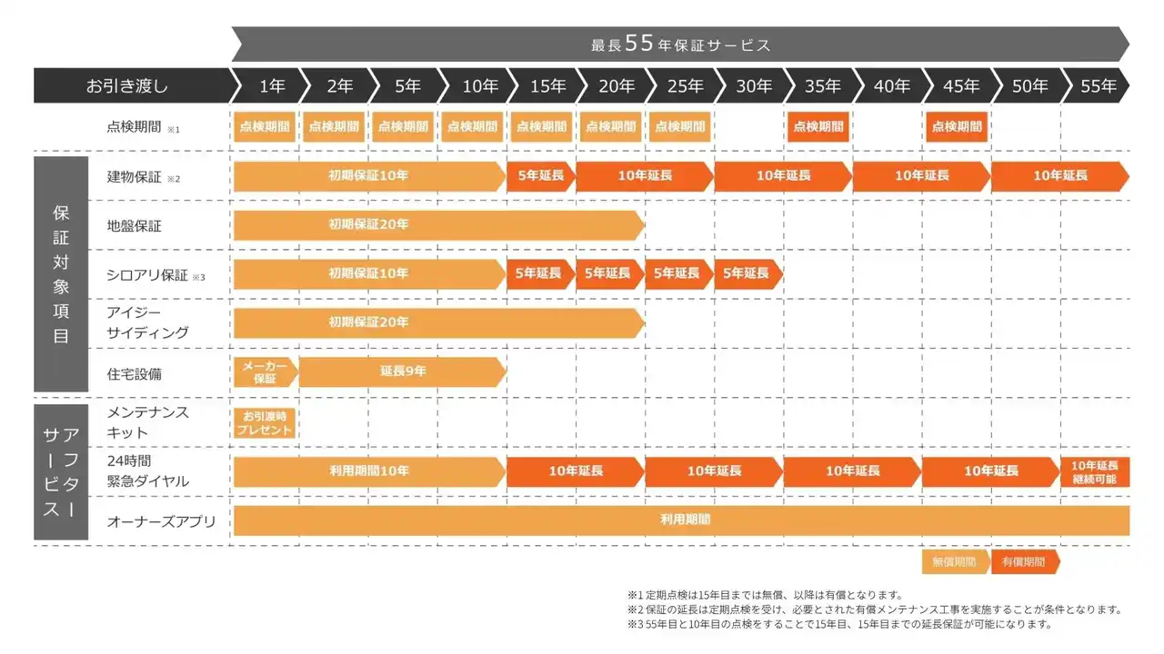 最長55年の長期保証: 構造・防水の安心を半世紀以上にわたってサポート。 |