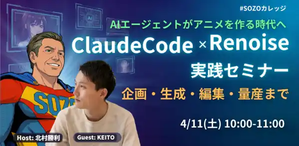本セミナーでは、AI×Web領域の第一線で活躍するKEITO氏をゲストに迎え、Claude Code と Renoise を切り口に、これからのAI動画制作・AIアニメ制作の変化を実演ベースでお届けします。