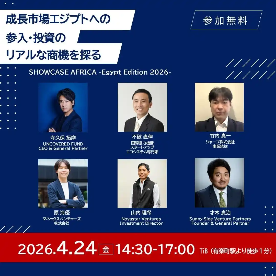 | エジプトを起点とした中東・アフリカ市場への進出機会と、スタートアップ・投資の最前線をテーマにしたイベント「SHOWCASE AFRICA -Egypt Edition 2026-」を、2026年4月24日(金)に開催いたします。 | ||||||||||||||