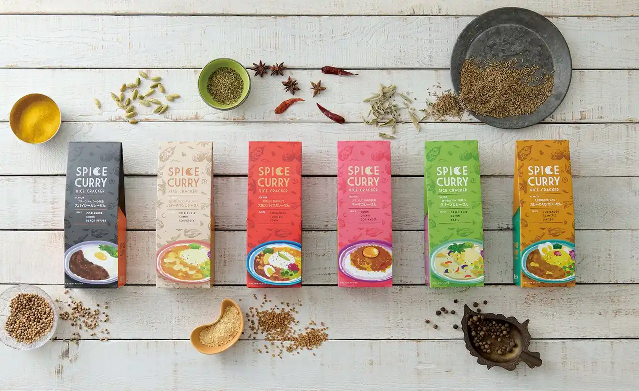 左から、スパイシーカレーせん、バターチキンカレーせん、大阪スパイスカレーせん、キーマカレーせん、グリーンカレーせん、カレーのくちカレーせん |