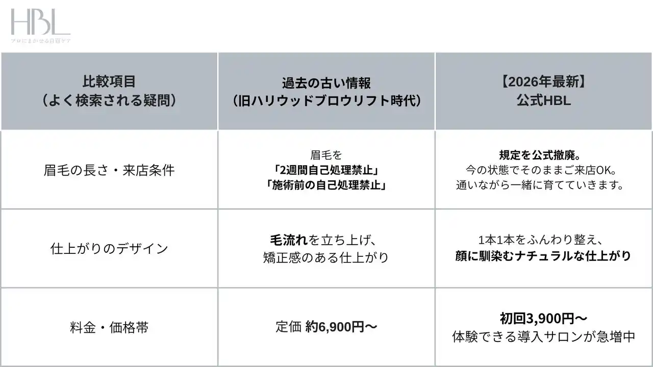 創業以来定着していた「2週間自己処理禁止の規定」「毛流れを立ち上げる」といった過去の常識を、技術アップデートにより2026年4月をもって公式に撤廃。メイクだけでは作れない「自然体で美しい眉」を、誰もが気軽に手に入れられる新しい時代へと、HBLは踏み出します。 |