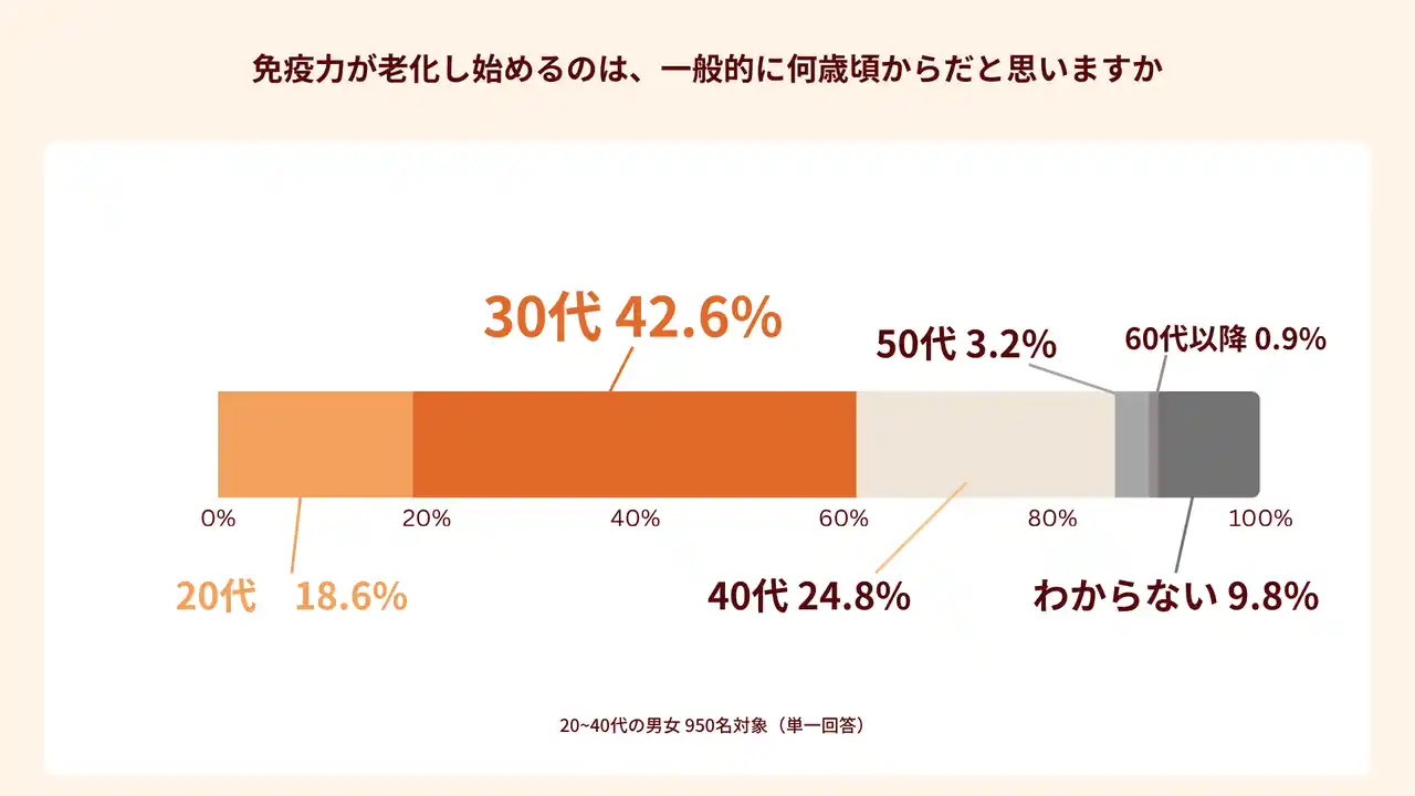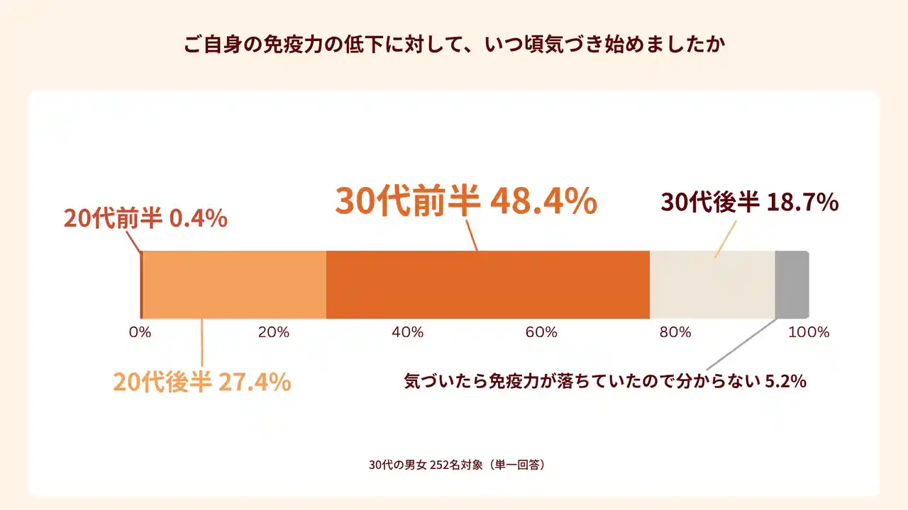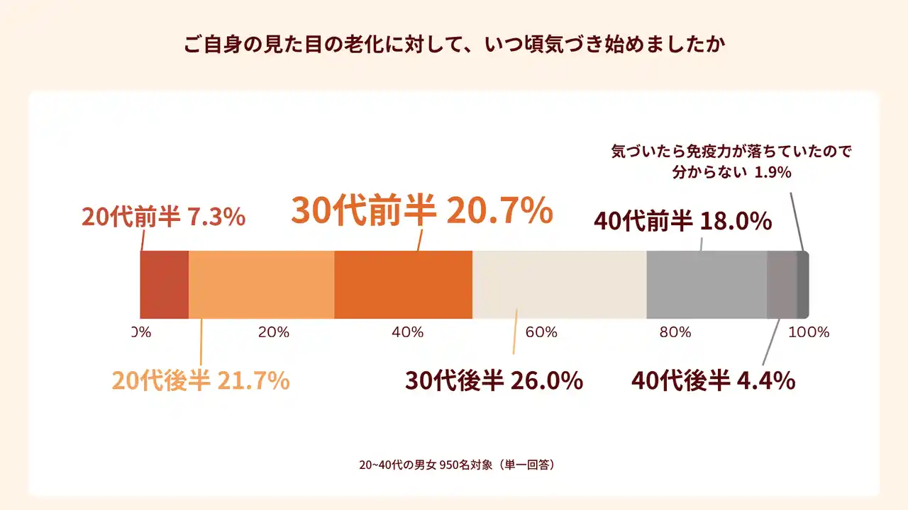 実際に30代回答者の48.4%が「30代前半」から免疫低下を自覚し始めており、これは見た目の老化に気づき始める時期とも合致している。 |