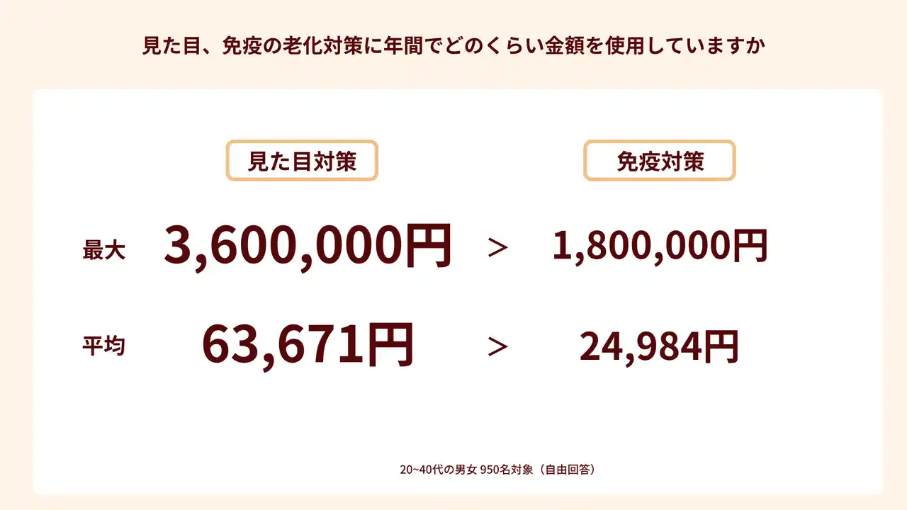 ●一方、外見、免疫、それぞれの老化対策に年間で費やしている費用を聞いたところ、平均金額の比較で外見の対策(63,671円)には免疫の対策(24,984円)の約2.5倍にあたる費用を費やしていることがわかった。 |