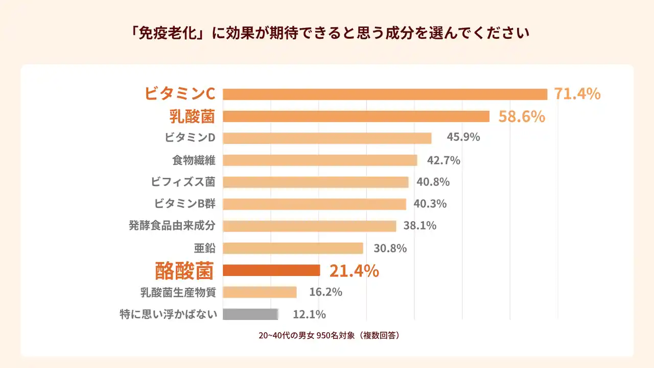 専門家が免疫老化対策の鍵として注目する「酪酸菌」への期待値は、わずか21.4%に留まった。 |