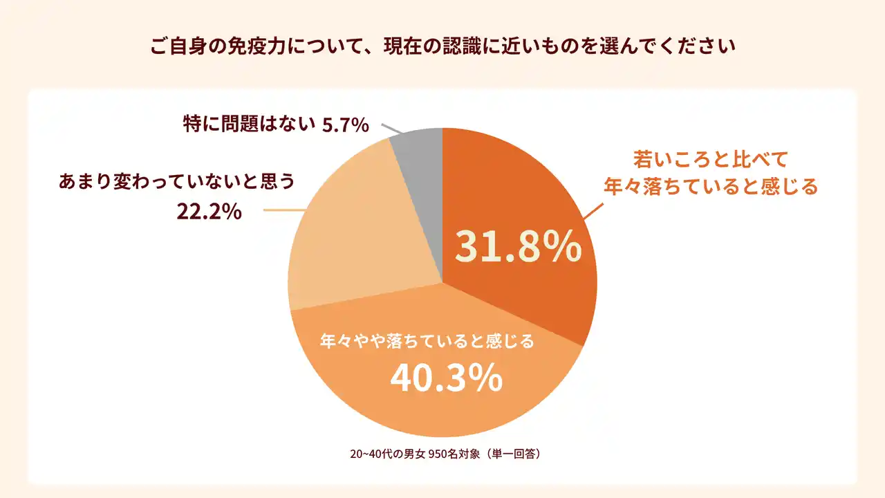 今回実施した「免疫と老化に関する意識調査」では、約9割が年齢と共に体調変化を実感しており、約7割の人が「若い頃と比べて免疫力が落ちている」と感じていることが分かりました。さらに、免疫の老化が始まる時期として「30代」を挙げる人が最も多く、肌などの見た目の変化とともに、内側の免疫の低下に直面していることが明らかになりました。 |